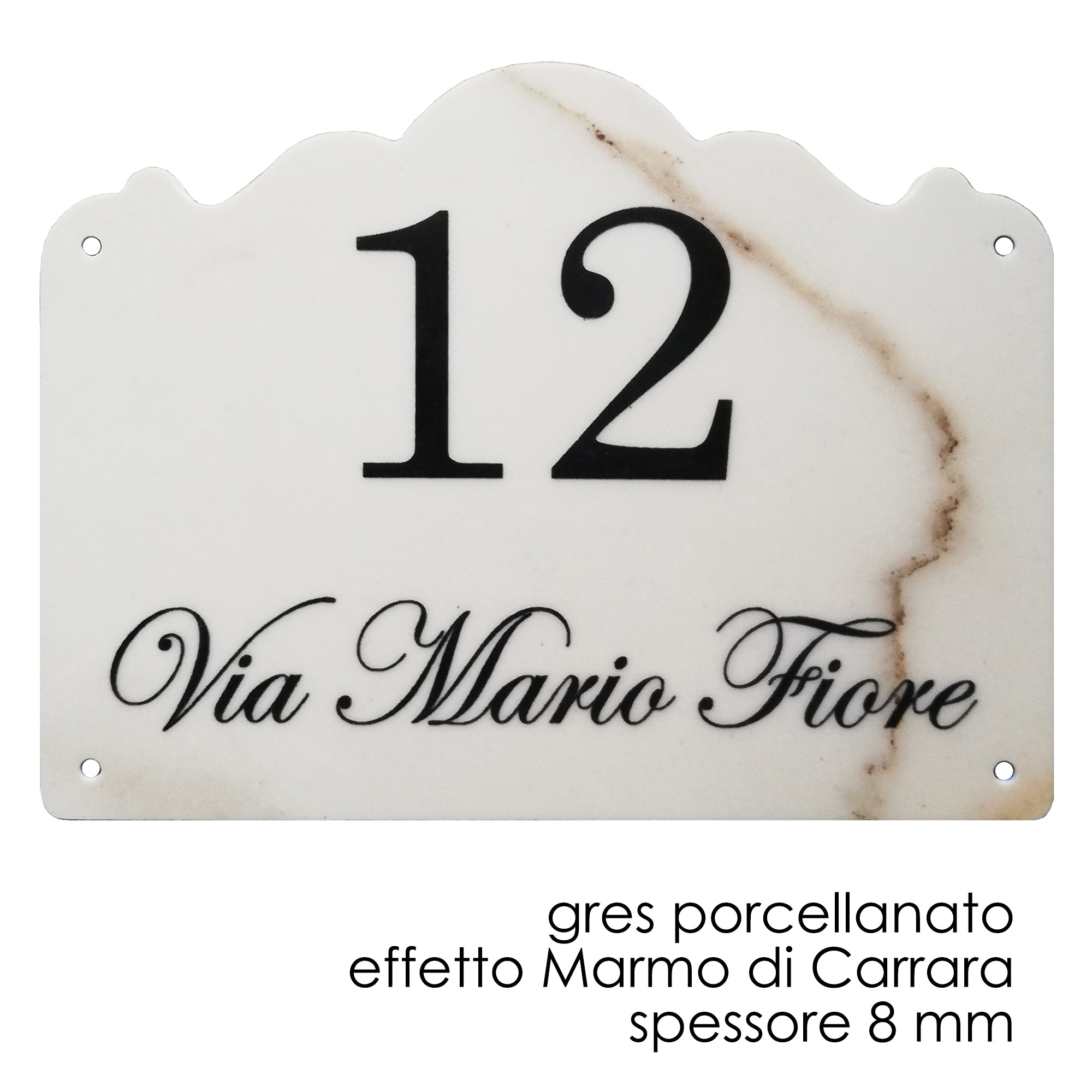 La targa è realizzata in ceramica di alta qualità, tagliata con tecnologia waterjet e incisa a laser. Solo il colore "Effetto Marmo di Carrara" è gres porcellanato.