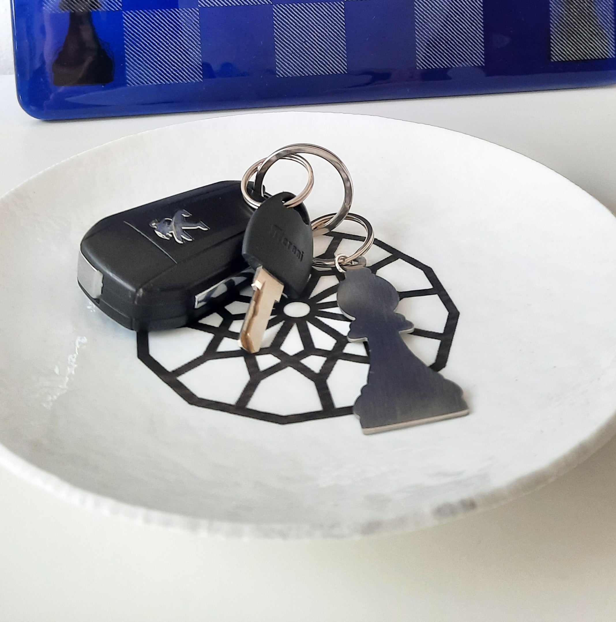 Il portachiavi a forma di Alfiere è il custode della diagonale. Con il suo movimento preciso e inesorabile, è un simbolo di intelligenza strategica e visione chiara, sempre pronto a proteggere il campo di battaglia da una posizione elevata.